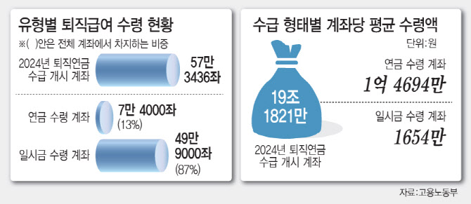 정부가 퇴직연금 담보대출 제도를 개선하고자 하는 것은 중도 인출을 줄여 연금으로 수령하는 비율을 높이기 위해서다. 지난해 일시금으로 타간 퇴직연금 평균 수령액은 1654만원으로, 연금으로 수령한 금액 1억 4694만원의 9분의 1 수준에 그쳤다. 적립금이 작을수록 연금 효과가 떨어져 일시금으로 수령하는 것이다. 지난해 수급 개시 계좌 중 일시금 수령 비율은 87%에 달했다.
