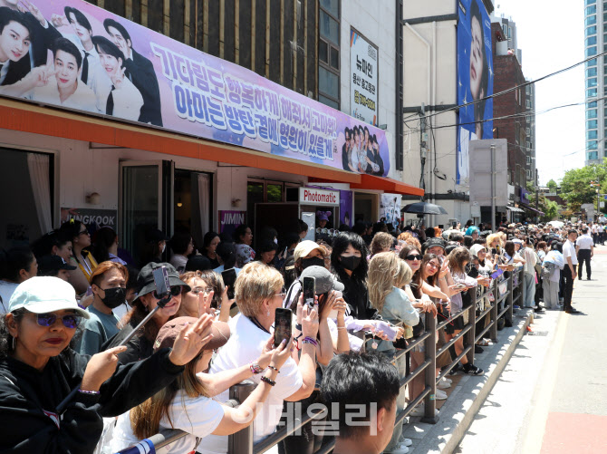 [이데일리 김태형 기자] 방탄소년단(BTS) 정국, 지민이 전역한 11일 서울 용산구 하이브 사옥 앞에서 국내외 아미( BTS 팬덤)들이 제대를 축하하기 위해 사옥 주변에 운집해 있다.